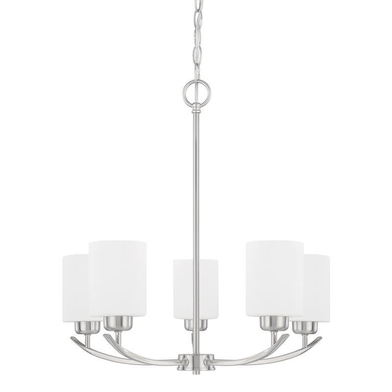 This 5-light chandelier from the Dixon collection is available in a brushed nickel or bronze finish that will complement many transitional and traditional decors throughout your home. The soft white glass shades soften the light creating a warm ambiance for many spaces.