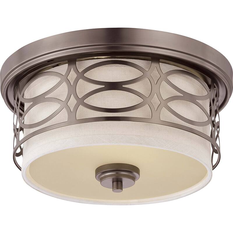 Upgrade your hallway or kitchen with this Harlow Bronze fixture by Nuvo Lighting. This light features a bronze-finished intersecting arch design surrounding a khaki fabric shade, making this flush mount pair perfectly with an elegant setting. Boasting a two-light structure, this flush dome fixture emits a warm, welcoming glow well-suited to mid-size rooms.