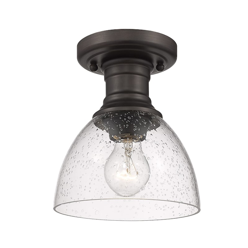 Offered in four smooth finishes, with two glass options, Hines is suitable for a variety of decors. The transitional style is a marriage of traditional silhouettes with modern finishes. The black, rubbed bronze, pewter and chrome fixtures are paired with opal or seeded glass shades. This semi-flush is approved for damp locations.