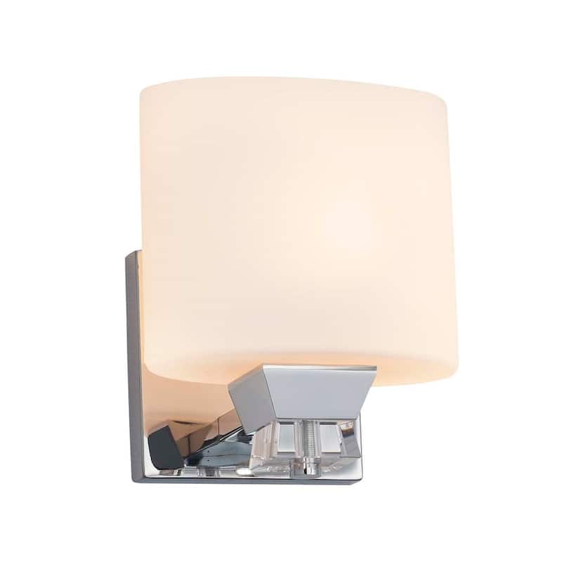 The Fusion Ardent Wall Sconce comes in a polished chrome finish with opal shade, this fixture is made of metal and artisan glass materials; Requires one (1) 100-watt E26 Medium Base bulb (not included).