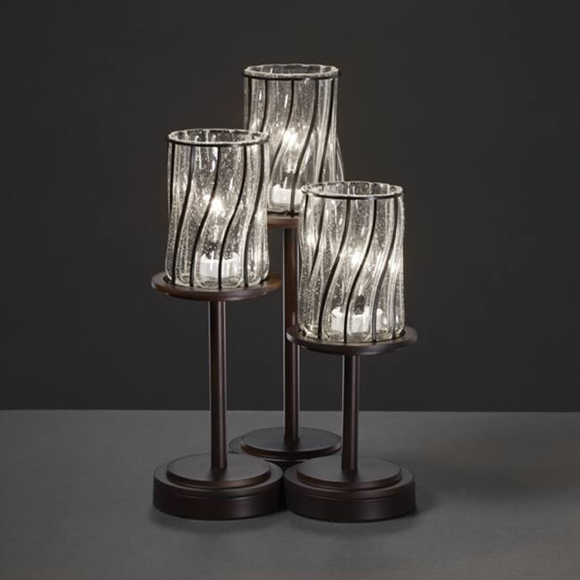 Justice Design Wire Glass Dakota 3-light Dark Bronze Table Lamp, Swirl with Clear Bubbles Cylinder - Flat Rim Shade