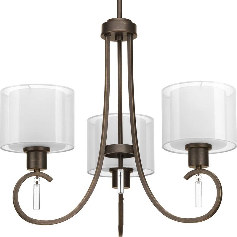 Progress Lighting Antique Bronze three-light Chandelier provides a welcoming silhouette in any home. Unique translucent sheer mylar shades encompass an inner glass globe.The rich, layering effect creates a dreamy look that is both elegant and modern. Offered as a complete collection, the Invite styling can be carried throughout your home or as a focal style in a special room.