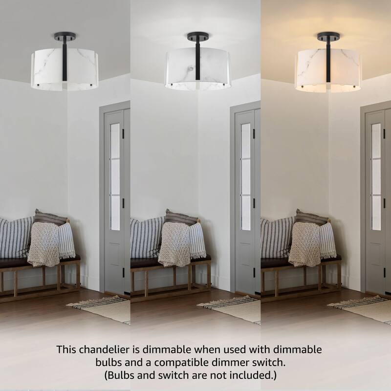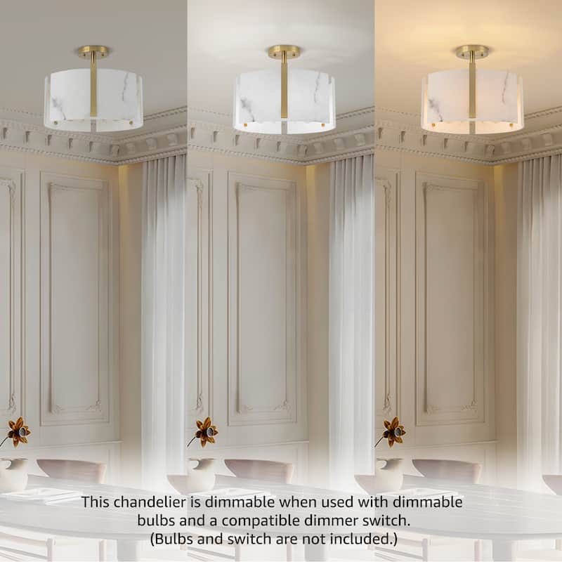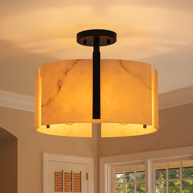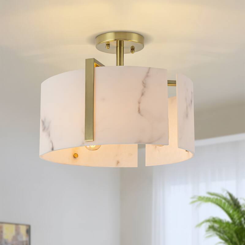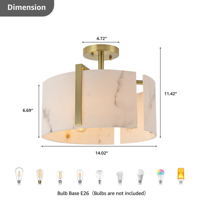 Bring refined elegance into your home with this modern flush mount ceiling light. Featuring a round frame paired with a natural alabaster-style shade, this fixture offers a one-of-a-kind look where every piece has its own unique veining and texture. The thick, solid glass construction adds weight and substance (7.7 lbs), ensuring a premium feel and lasting durability. At 14.02 inches wide and 11.42 inches high, it provides the perfect balance of presence and practicality. Available in two finishes—matte black for timeless versatility or plated gold for a warm, contemporary accent—this ceiling light complements a wide variety of interior styles. Designed with three E26 sockets, it works beautifully with dimmable bulbs and compatible switches, allowing you to create the perfect ambiance in any room.
