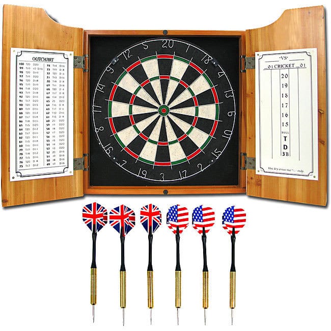 This Solid Pinewood Dart Cabinet comes with everything you need to start playing. It includes a high quality, self-healing dart board, 6 steel tip darts, dry-erase scoreboard, out chart, marker and mounting supplies.